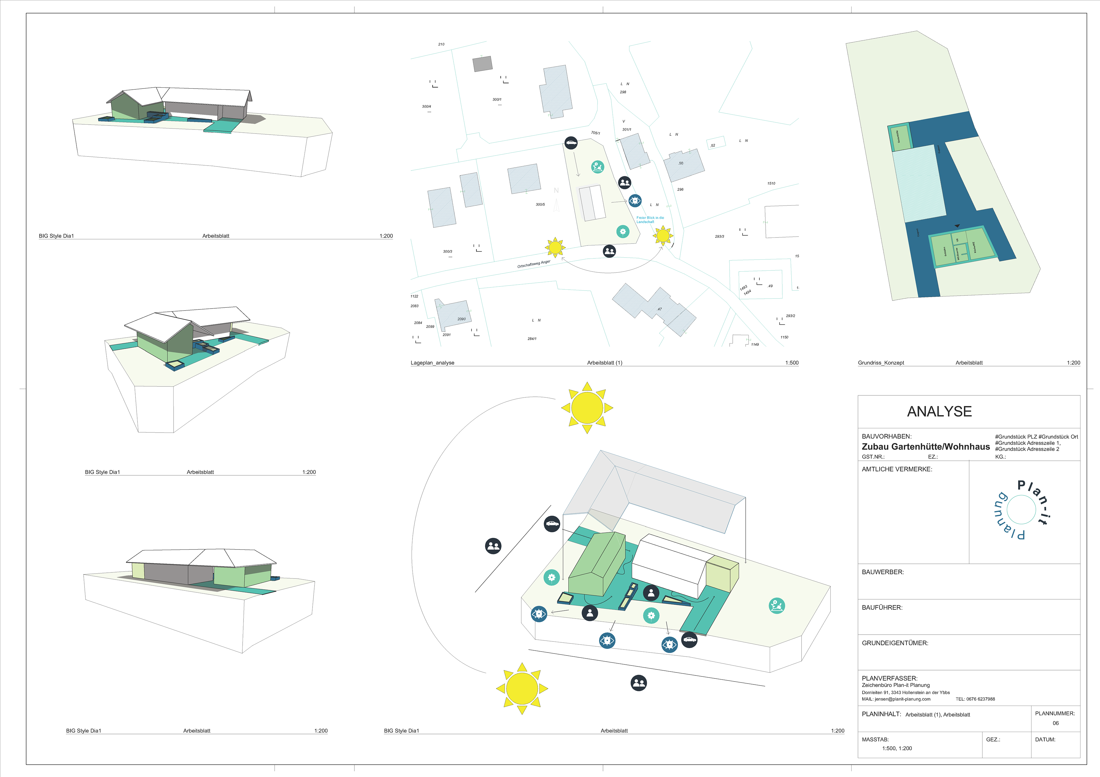Umfangreiche Analyse der örtlichen Gegebenheiten wie Aussichtspunkte, Sonnenstand, Eingangssituation sowie öffentlich-private Bereiche, inklusive Baukörperstudie und schematischem Grundrisskonzept.